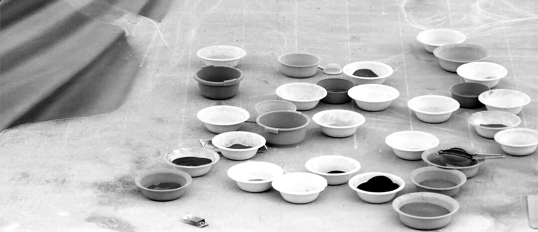 La similitud es correcta, pero con un detalle muy significativo: la sustitución de las brochas por las manos, y la pintura por las tierras. Conforme avanza el trabajo, el dibujo toma sentido con gestos delicados de muñeca, donde la destreza de sus dedos dejan caer como por arte de magia los granos suficientes en una pintura que lentamente cobra vida sobre un soporte llamado suelo. Las líneas de tiza blanca desaparecen y dan paso al magnífico resultado de un lienzo multicolor de tierra natural.